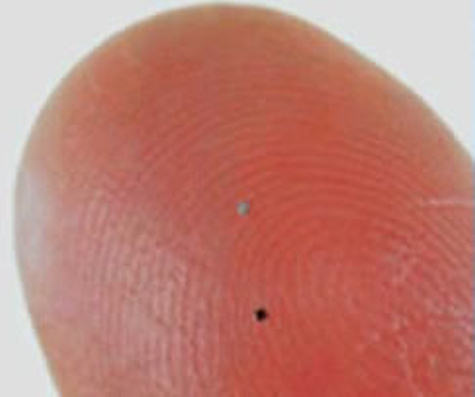 La nouvelle puce est 64 fois plus petite que la mu-chip et un peu plus petite que le diamètre d’un cheveu humain. Tout comme son aînée, la mémoire (D’une manière générale, la mémoire est le stockage de l’information. C’est aussi le souvenir d’une information.) est de 128 bits ce qui permet d’obtenir une identification par un nombre (Un nombre est un concept caractérisant une unité, une collection d’unités ou une fraction d’unité.) à 38 chiffres. Rien n’a été communiqué cependant sur la distance de lecture mais on peut supposer que les 25 cm de la mu-chip ont été conservés ou approchés. Pour obtenir cette puce de la taille d’un grain (En météorologie maritime: Un grain est un vent violent et de peu de durée qui s’élève soudainement et qui est…) de poudre, une nouvelle miniaturisation des semi-conducteurs a été faite et la puce est gravée par des faisceaux d’électrons.